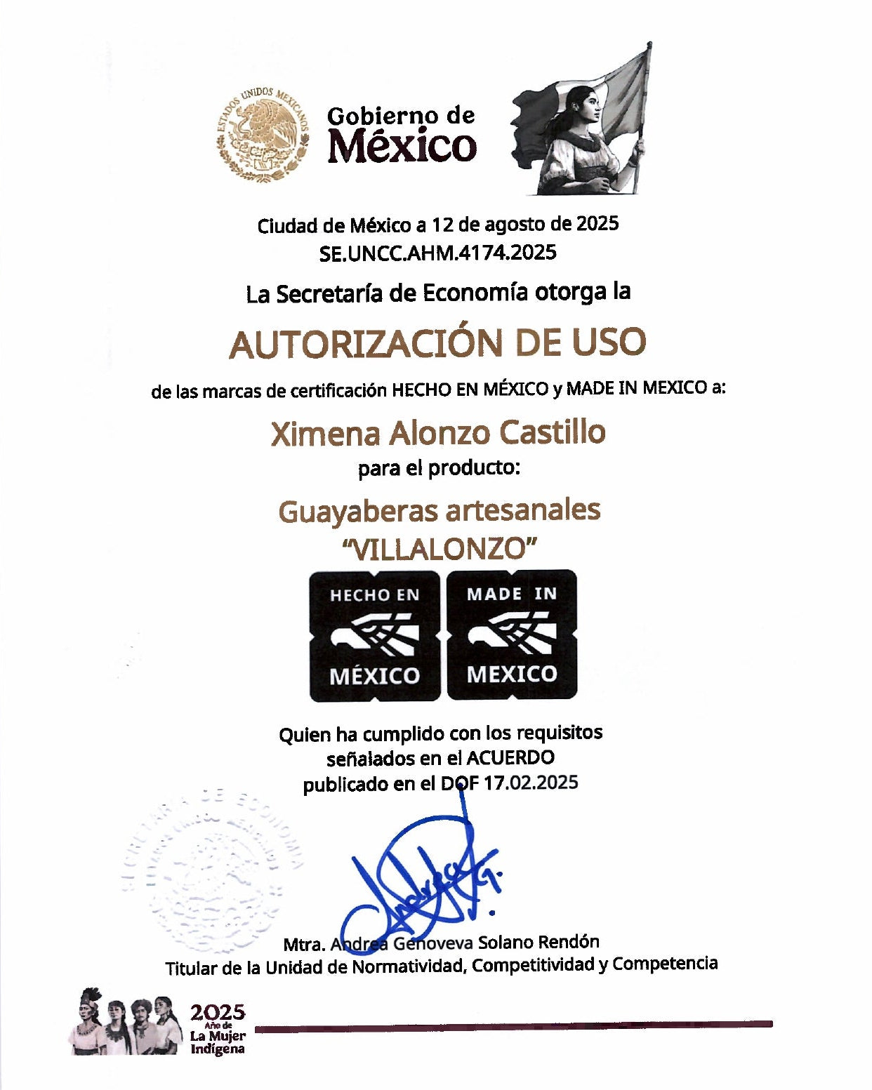 Este reconocimiento certifica que nuestras guayaberas son elaboradas en México, cumpliendo con los lineamientos de calidad, origen y procesos productivos establecidos, reafirmando nuestro compromiso con la artesanía nacional y el talento mexicano.